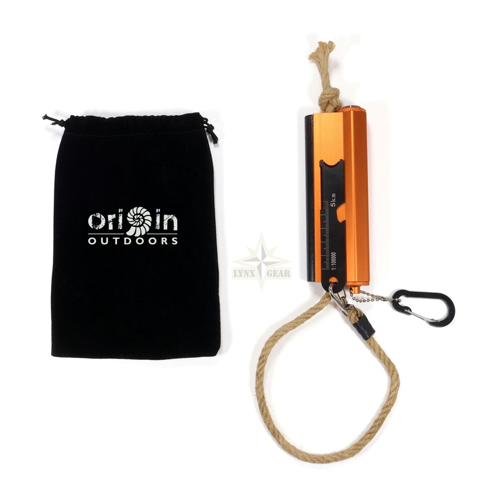 The aluminum housing contains a waterproof storage capsule for tinder or small essentials, and an integrated compass for basic orientation. The scraper multi-tool doubles as a bottle opener and map ruler, making this a true all-in-one survival accessory.