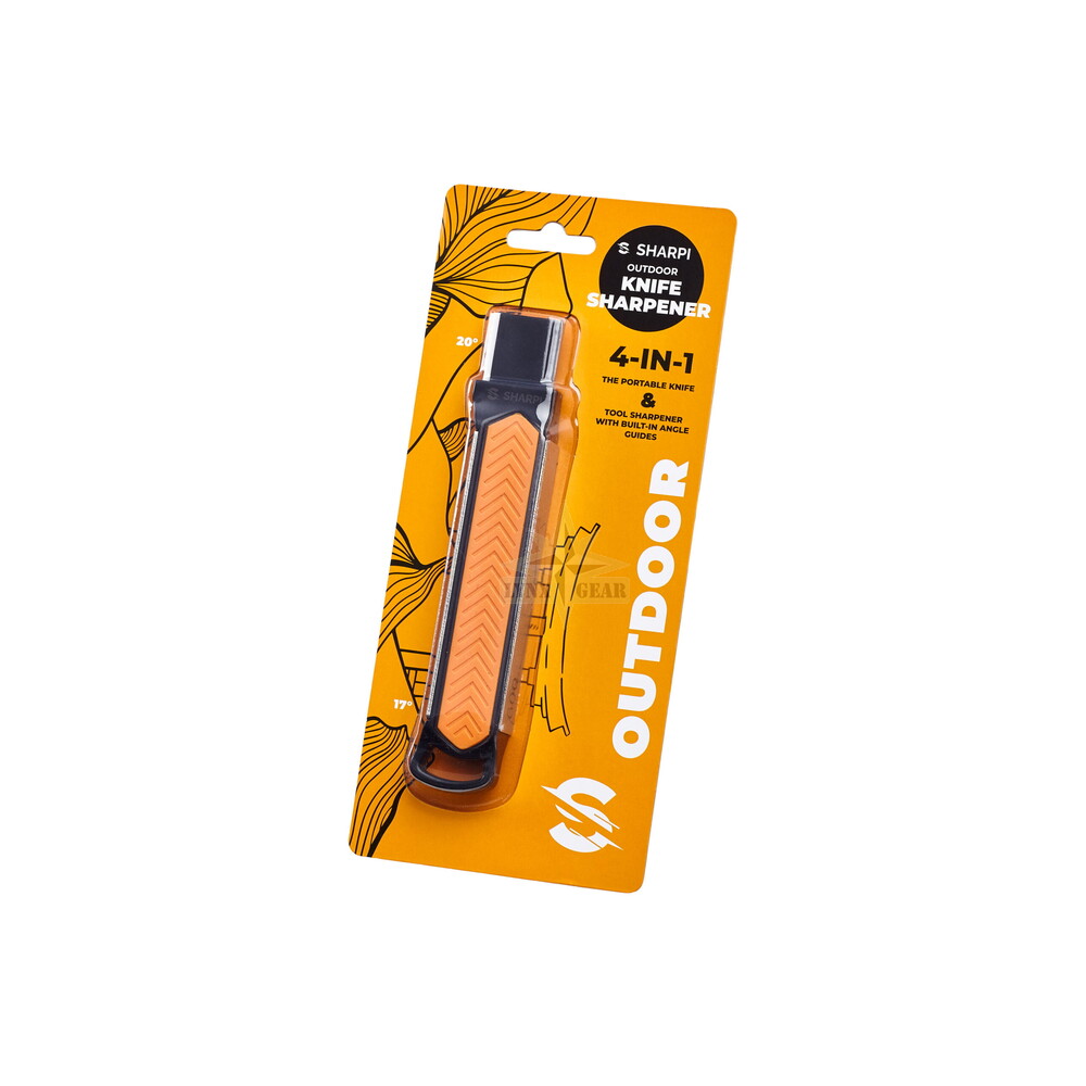 The SHARPI 4in1 Diamond Knife Sharpener is a compact, multi-surface sharpening tool designed to deliver precision and versatility for both home and outdoor use. Equipped with four abrasive surfaces — diamond #320, diamond #600, ceramic, and tungsten carbide — it ensures that knives of all kinds can be restored to razor-sharp edges quickly and effectively. Its built-in angle guides (17° and 20°) simplify maintaining the correct sharpening angle, enhancing accuracy for beginners and professionals alike.