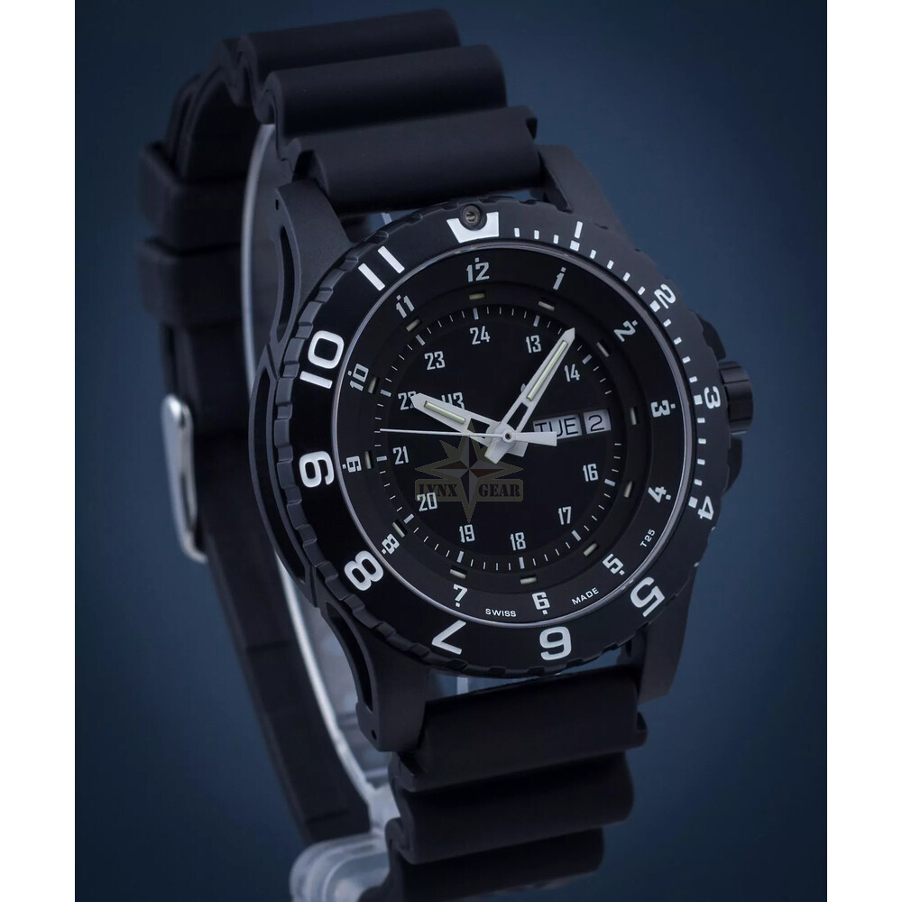 The 45 mm case features a combination of black stainless steel and reinforced polymer for superior impact resistance and reduced weight. Its matte black dial enhances legibility, complemented by a unidirectional rotating bezel and easy-grip crown. The luminous green and orange Trigalight® markers ensure constant visibility without external light exposure. The black rubber strap delivers long-lasting comfort during extended field use.