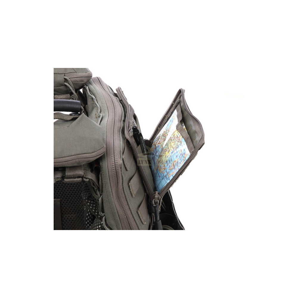 Ārpusē somiņai ir MOLLE stiprinājuma joslas priekšpusē un Velcro pārklāta zona uzšuvēm. Iekšpusē atrodas caurspīdīgs logs kartēm vai piezīmēm, kā arī elastīgi nodalījumi, kas palīdz nostiprināt pildspalvas un dokumentus kustības laikā.