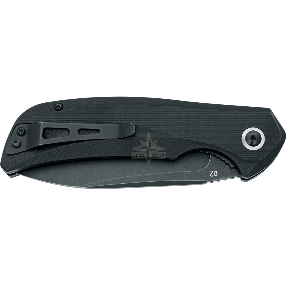 Melnais PTFE pārklājums nodrošina papildu aizsardzību pret koroziju un samazina atspīdumu, kas ir īpaši noderīgi āra un “tactical” stila EDC lietošanā. Augstais oglekļa saturs D2 tēraudā nodrošina lielisku asuma noturību, savukārt G10 rokturis ir izturīgs pret mitrumu un triecieniem, prasot minimālu kopšanu.