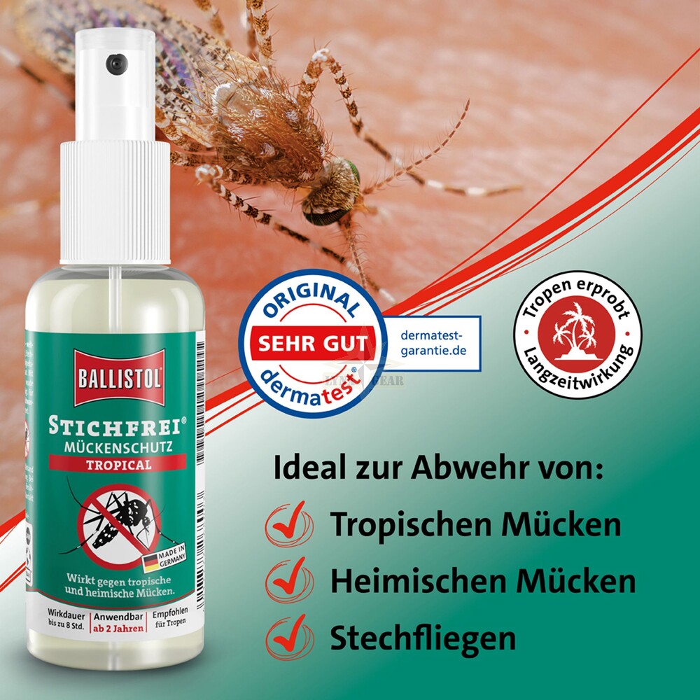 Ballistol Stichfrei Tropical ir augstas veiktspējas insektu atbaidītājs gan ceļojumiem uz tropiem, gan vietējai lietošanai dabā. Tas veido neredzamu aizsargkārtu uz ādas un palīdz atbaidīt odus, ērces un dundurus – arī karstos un mitros apstākļos. Formula apvieno 20% Ikaridīnu ar 5% Citrepel® (PMD), nodrošinot līdz 8 stundām aizsardzību. Līdzeklis ir bez DEET, ātri iesūcas un nav taukains.